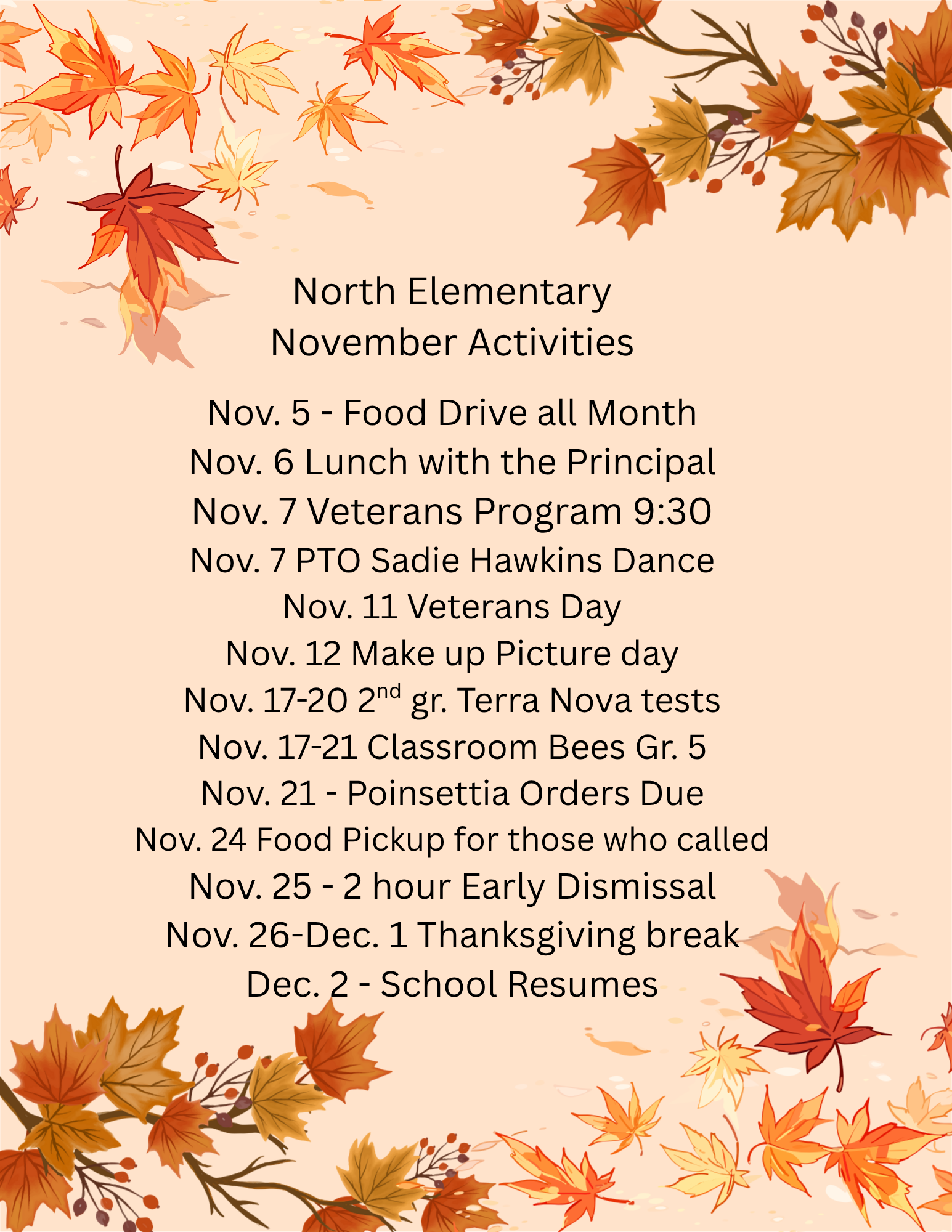 The attached flyer describes the activities that are already scheduled for the month of November. Please note that we will be collecting food the entire month to help create a food bank for those in need. Please be generous if you can. If you need help please call the school.