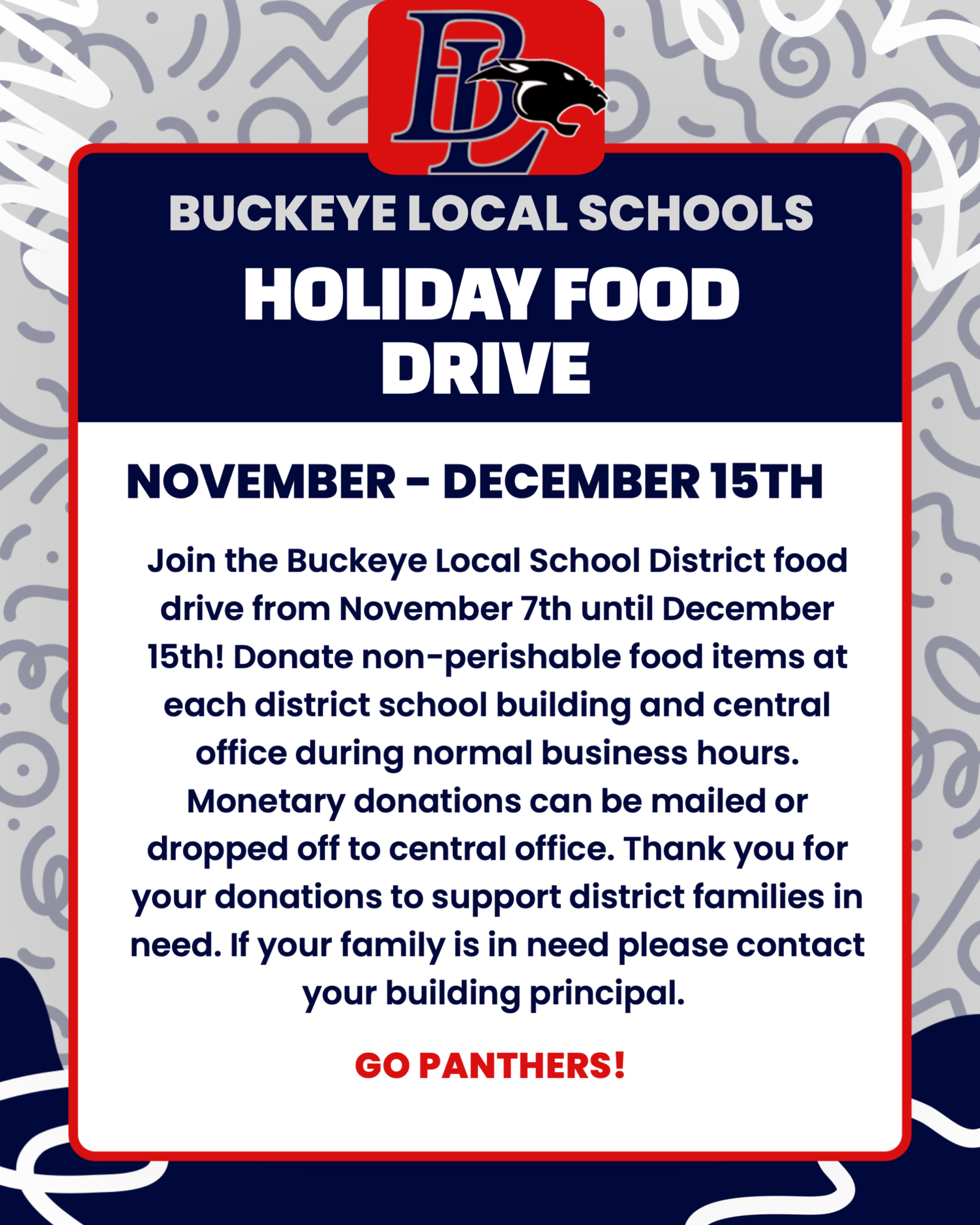 We at Buckeye Local School District will be conducting food drives at every building including the Central Office to help those in need of food items. You may drop them off at any building from November 7 - December 15. Monetary donations may be dropped off or mailed to Central Office in Dillonvale. Please be generous if you can to help our neighbors.